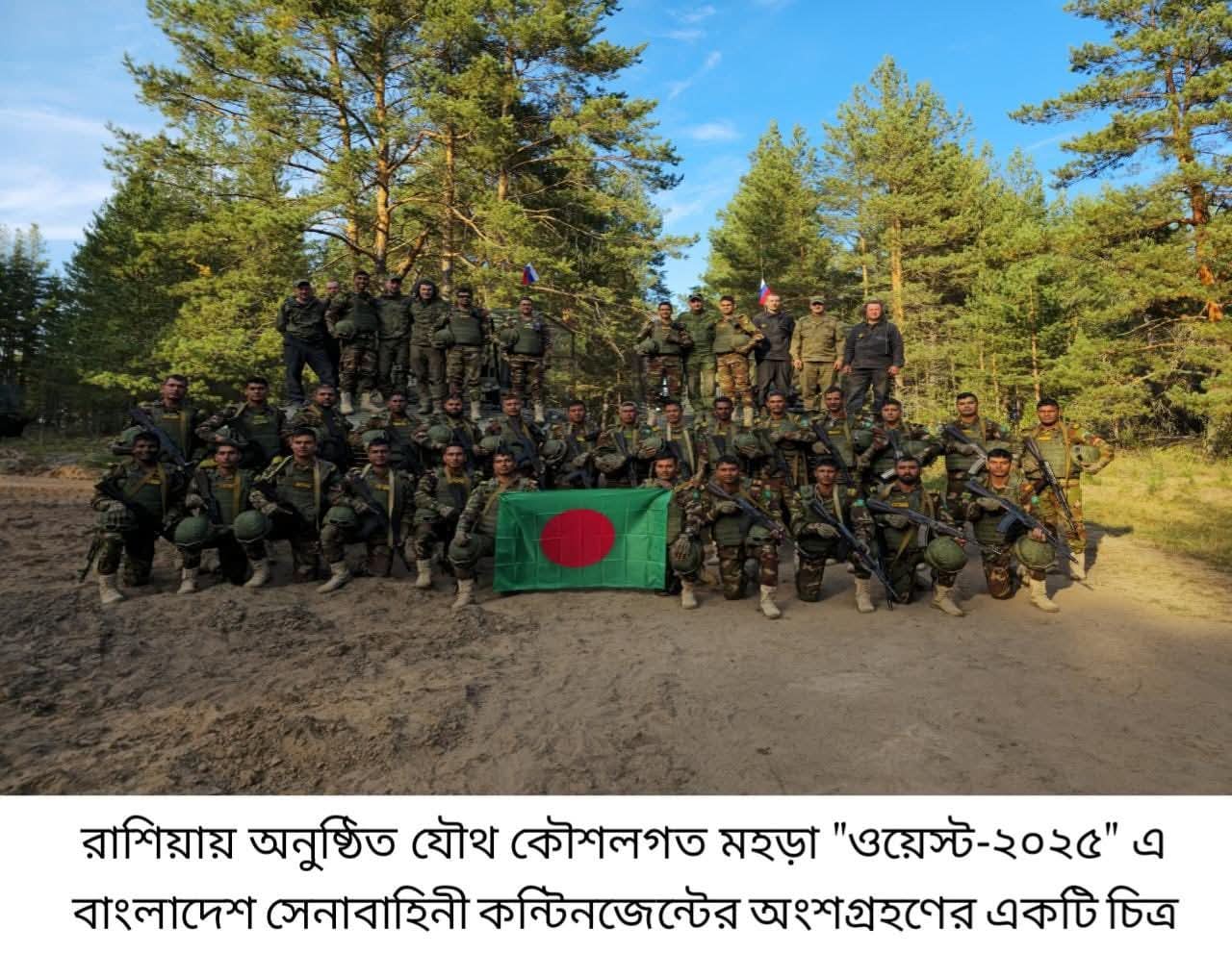 ঢাকা, ১৯ সেপ্টেম্বর ২০২৫ (শুক্রবার): সাম্প্রতিক সময়ে বাংলাদেশ সেনাবাহিনী পারস্পরিক সহযোগিতা বৃদ্ধি এবং কৌশলগত যৌথ আভিযানিক সক্ষমতা উন্নয়নের লক্ষ্যে বিভিন্ন দেশের সঙ্গে নিয়মিতভাবে যৌথ ও বহুজাতিক মহড়ায় অংশগ্রহণ করছে। এরই ধারাবাহিকতায়, বাংলাদেশ সেনাবাহিনীর একটি চৌকস কন্টিনজেন্ট গত ০১ সেপ্টেম্বর ২০২৫ থেকে ১৭ সেপ্টেম্বর ২০২৫ তারিখ পর্যন্ত রাশিয়ায় আন্তর্জাতিক যৌথ কৌশলগত মহড়া "ওয়েস্ট-২০২৫" এ সফলভাবে অংশগ্রহণ করে। বাংলাদেশ সেনাবাহিনীর মোট ৩৭ জন সেনাসদস্য রাশিয়ার নিঝনি নভগোরোদ নামক অঞ্চলের মুলিনো মিলিটারি ট্রেইনিং গ্রাউন্ডে এই মহড়ায় অংশ নেয়।